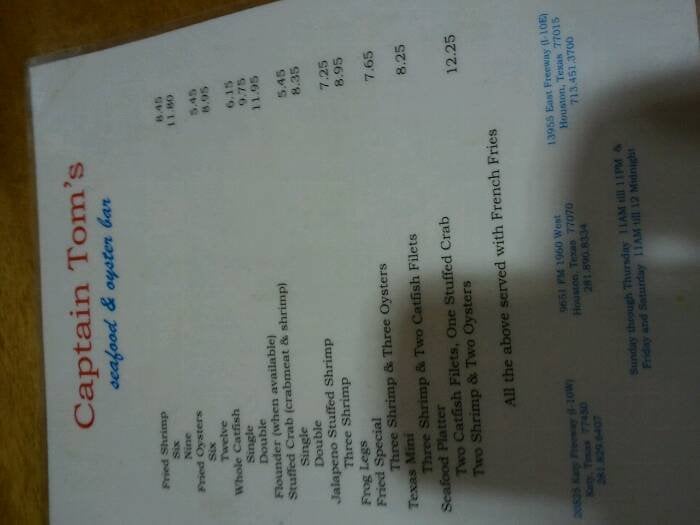 Introducing the menu at Captain Tom's Seafood and Oyster Bar, a bustling seafood spot in Houston, TX. This casual restaurant offers a variety of dishes, from fried shrimp to flounder and fried catfish. The menu also includes appetizers like hush puppies, stuffed jalapenos, and crawfish tails, perfect for sharing or enjoying solo. Customers rave about the gumbo, fresh oysters, and micheladas, making this place a must-visit for seafood lovers. The service is quick and friendly, and the ambiance is unique with a ship-shaped restaurant design. With plenty of vegetarian options, this restaurant caters to all palates. Whether you're dining in or getting takeout, Captain Tom's Seafood and Oyster Bar promises a memorable experience with delicious food and a lively atmosphere.